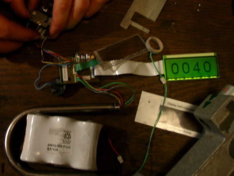 Im November 2003 wurde uns ein CallABike ‘zugetragen’, das nicht richtig abgeschlossen wurde. Dieses musste erstmal als Testobjekt herhalten. Die meisten dachten, dass in dem Schlosskasten GPS oder sonstiger Funk enthalten sei, nach dem öffnen war hiervon jedoch nix zu sehen. Um die Schrauben der Schlosskästen zu öffnen, benötigt man nur ein Torx TR (Tamper Resistant). In dem Kasten ohne Display ist die Stromversorgung durch Batterien sichergestellt (3x 1.5V Mono). Die beiden Kästen sind durch eine Art Bügel miteinander verbunden. In diesem Bügel befindet sich ein sechspoliges Kabel für den Strom und zwei Spulen. Damit kann geprüft werden, ob das Schloss wirklich geschlossen ist, oder einfach kein oder nur irgendein anderer Bolzen zum Verschließen genommen wurde.