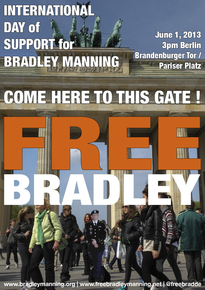 Angeklagt wegen »Unterstützung des Feinds« (Aiding the Enemy) droht ihm lebenslange Haft: Am 3. Juni beginnt der Prozeß gegen Bradley Manning. Am Samstag, den 1. Juni, dem internationalen Aktionstag zur Unterstützung Mannings, findet eine Kundgebung am Pariser Platz in Berlin statt. Kommt zahlreich!